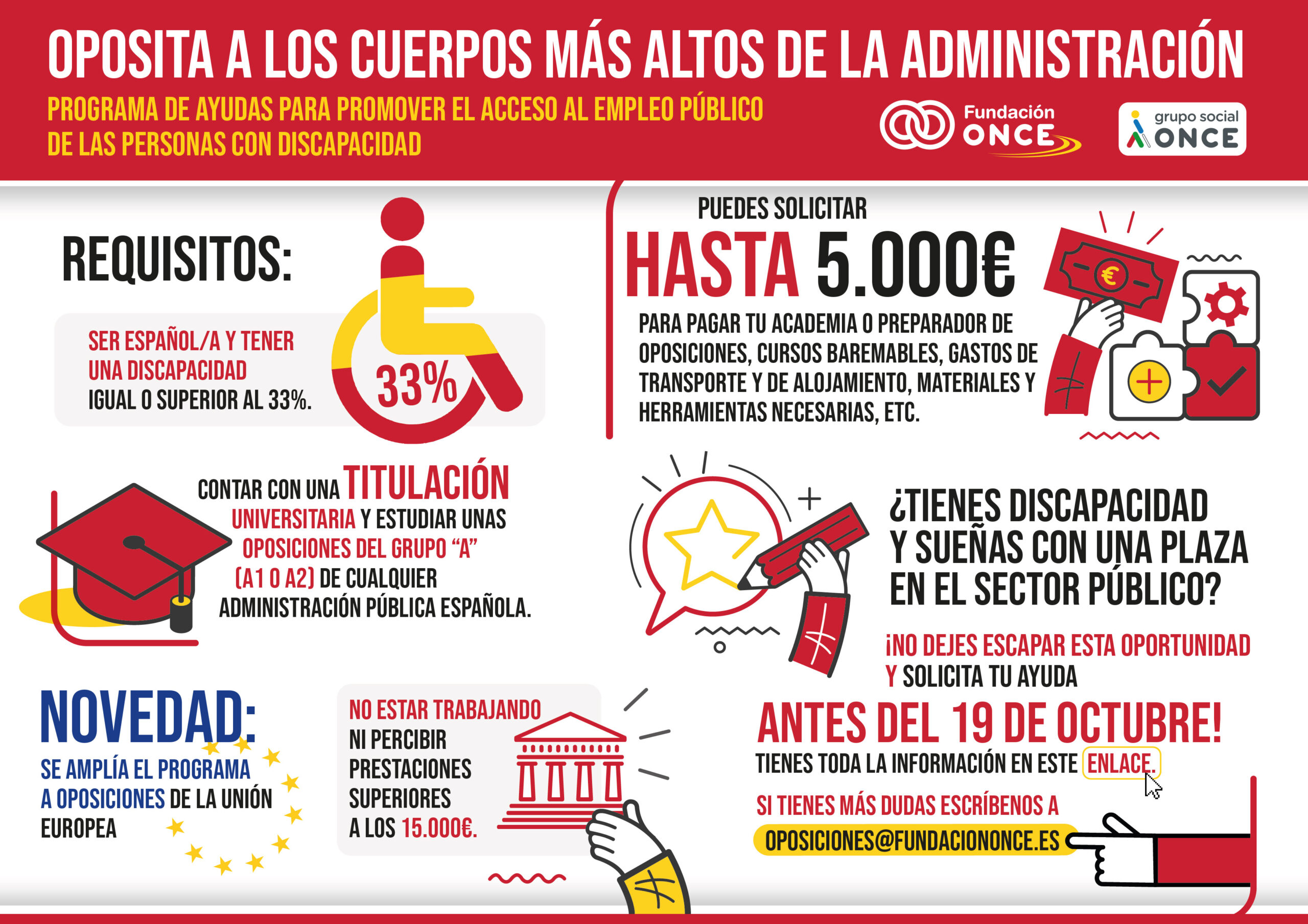 El plazo de solicitud finaliza el 19 de octubre de 2025 y toda la información está disponible en el Portal de Becas de Fundación ONCE:https://becas.fundaciononce.es/Paginas/BecasOposiciones.aspx
