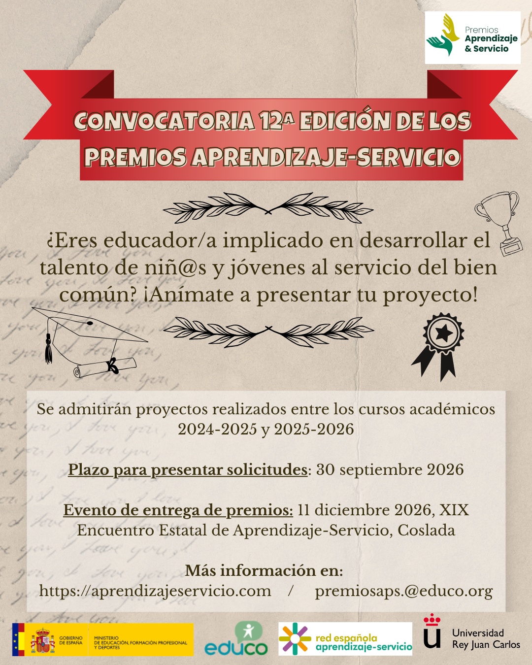 La Red Española de Aprendizaje-Servicio y la ONG Educo, con la colaboración del Ministerio de Educación, Formación Profesional y Deportes vuelven a impulsar la convocatoria Premios Aprendizaje Servicio 2026, que este año cumple su duodécima edición, dirigida a centros de educación Infantil Primaria, ESO-Bachillerato y Formación Profesional y Ocupacional, así como a entidades sociales que estén desarrollando prácticas de aprendizaje-servicio.