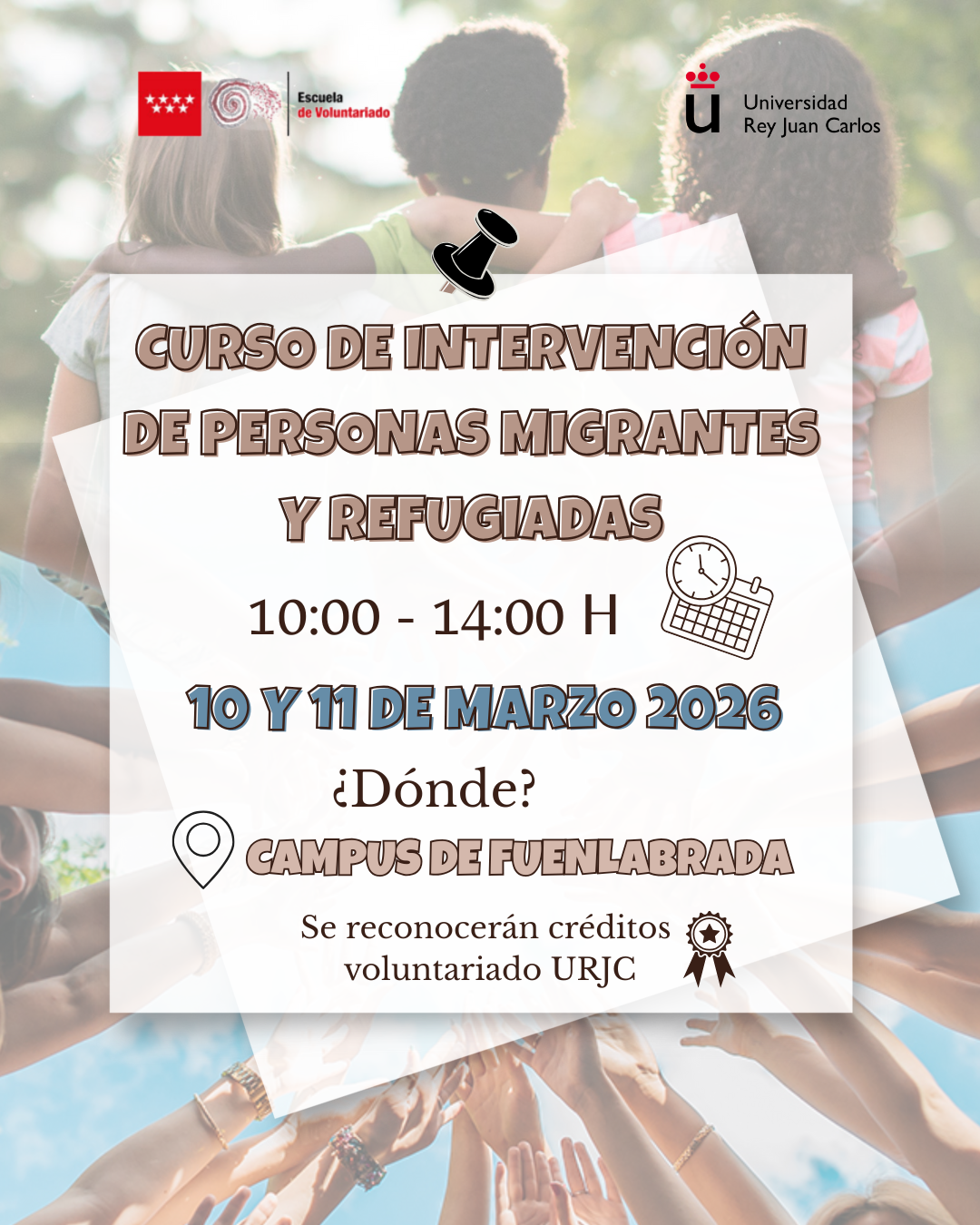 Curso de intervención de personas migrantes y refugiadas Ene 23, 2026 | Actividades ESCUELA DE VOLUNTARIADO DE LA COMUNIDAD DE MADRID PROGRAMACIÓN MESES ENERO-MARZO 2026 FECHA: 10 Y 11 DE MARZO 2026 HORAS DOCENCIA: 8 CURSO: INTERVENCIÓN DE PERSONAS MIGRANTES Y REFUGIADAS HORARIO: 10:00 A 14:00 H PIV: PIV URJC (CAMPUS FUENLABRADA)