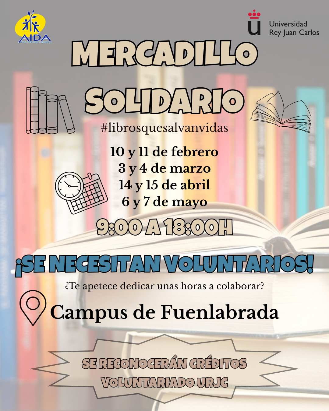 Desde la Unidad de Cooperación al Desarrollo y Voluntariado en colaboración con la ONG AIDA ponemos en marcha un mercadillo de libros solidario para el que necesitaremos voluntario/as.Este se llevará a cabo los días: