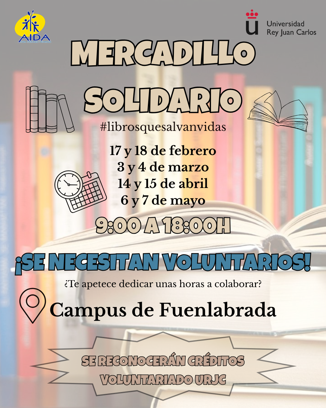 Desde la Unidad de Cooperación al Desarrollo y Voluntariado en colaboración con la ONG AIDA ponemos en marcha un mercadillo de libros solidario para el que necesitaremos voluntario/as.